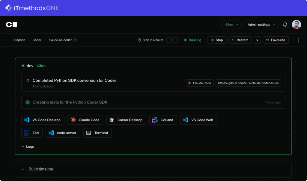 With Coder + iTmethodsONE, you can launch secure, cloud-native workspaces that are pre-configured, scalable, and ready to go in minutes.